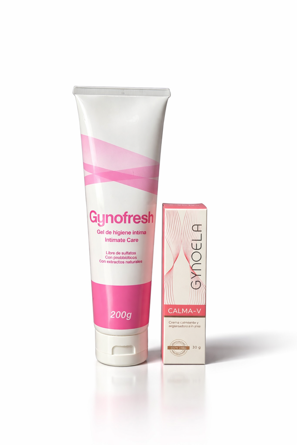 Combina la frescura en tu higiene intima con Gynofresh, que gracias a su contenido de Postbioticos, mejora el sistema de defensa natural de tu zona V, eliminando las bacterias causantes del mal olor, irritaciones, inflamacion e infecciones, con el poder calmante de nuestra crema Calma V, que controla la irritacion causada por la depilacion, post ciclo menstrual, residuos de orina, etc.